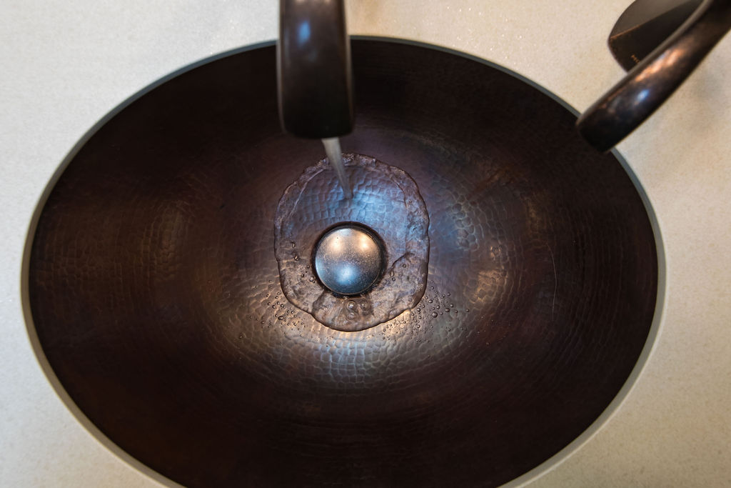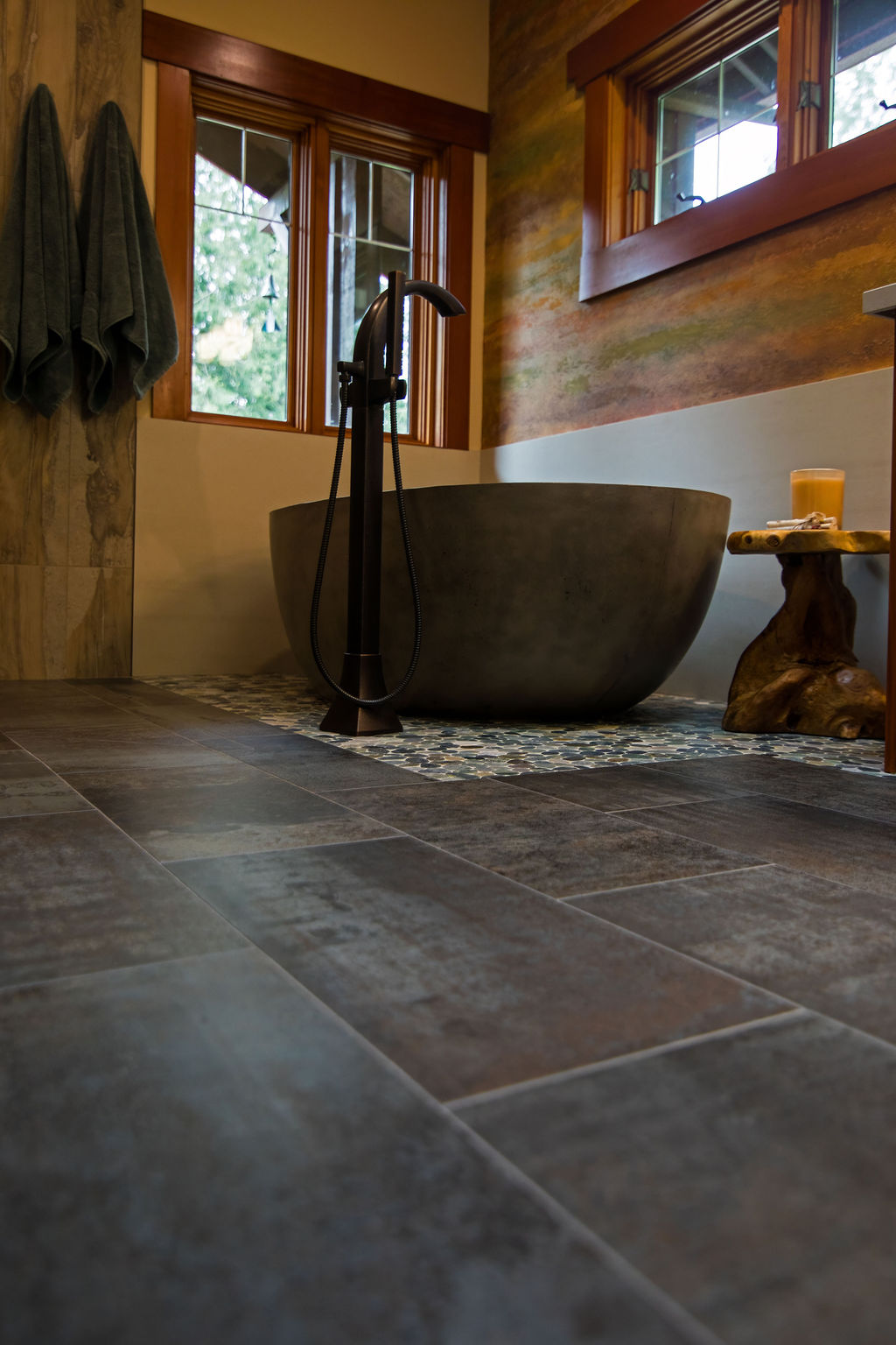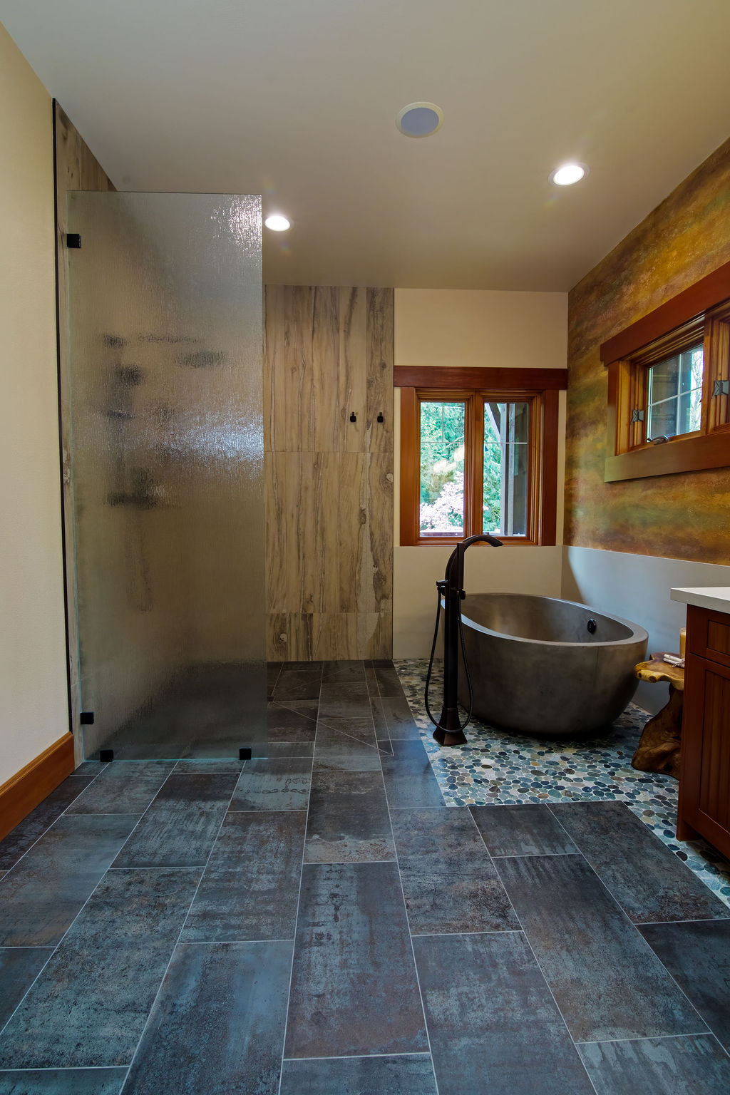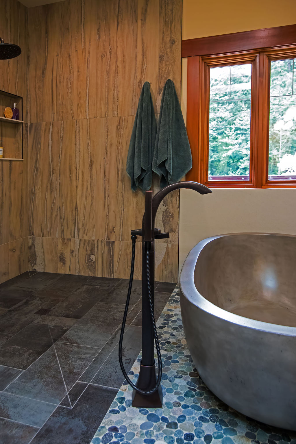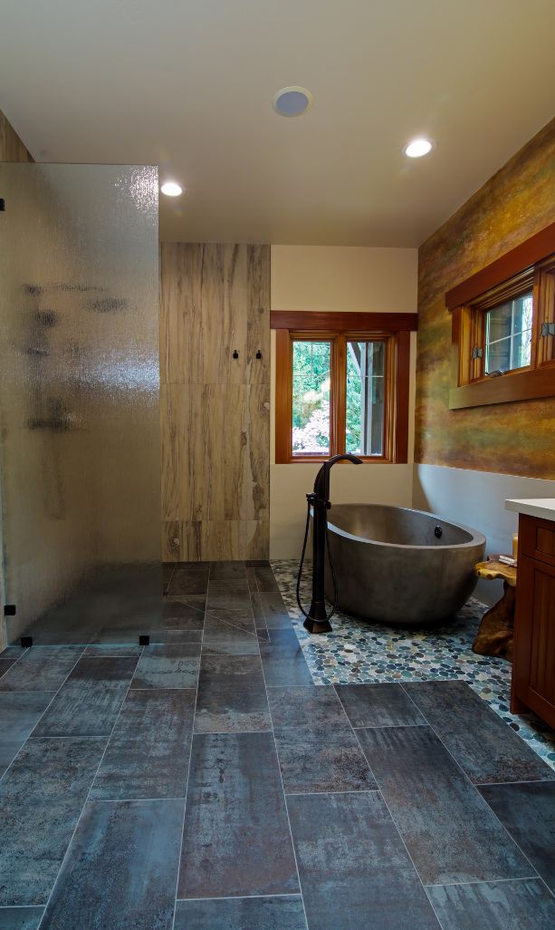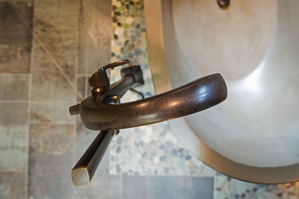 Our clients had one non-negotiable: no white plumbing fixtures. Finding a beautiful, non-white bathtub was a challenge—until we remembered Native Trails’ stunning concrete tubs. We arranged for samples, and the moment they saw the textured concrete, they were sold. We paired the tub with breathtaking copper sinks that echoed the warmth of the home’s woodwork.