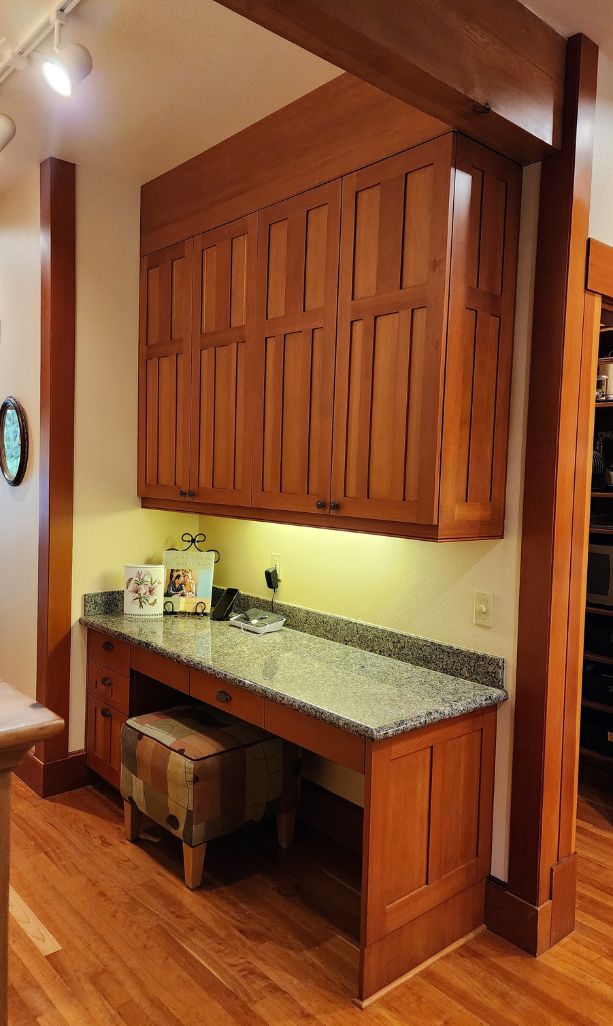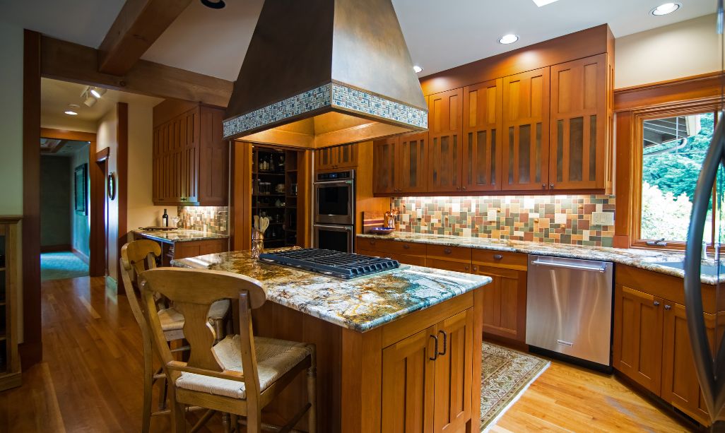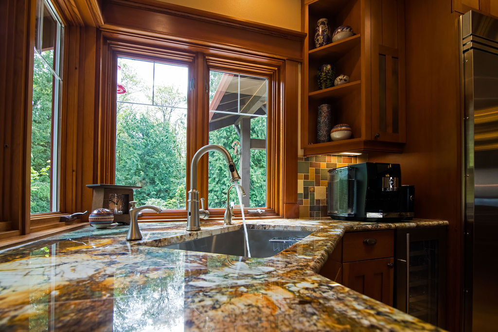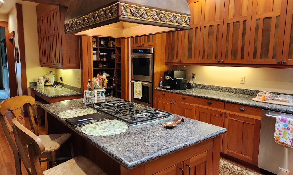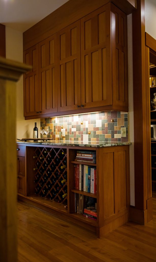 The backsplash design was another exercise in precision. Handmade ceramic tiles, with uneven textures that mimic stone, tied the colors of the countertop into a truly Craftsman aesthetic. We coordinated these tiles with the range hood surround and the new custom-built wine bar, replacing an outdated desk nook.