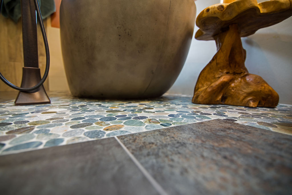 Every selection was intentional: wood, stone, glass, and natural textures to honor the Craftsman style. From the rain-glass shower panel to the pebble “river” skirting the vanity, each choice added depth without overwhelming the room.