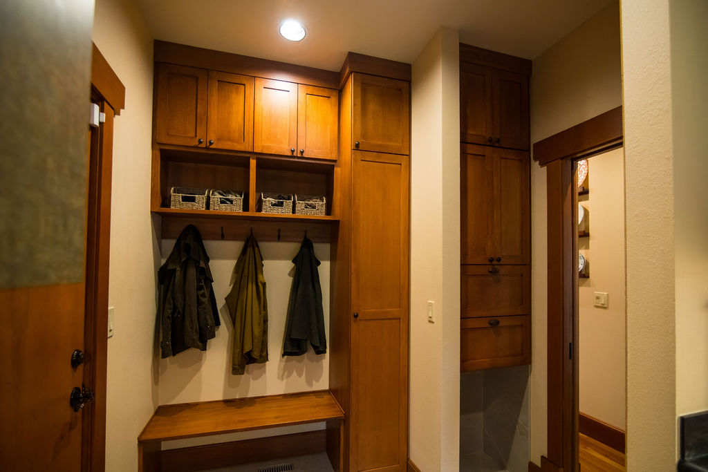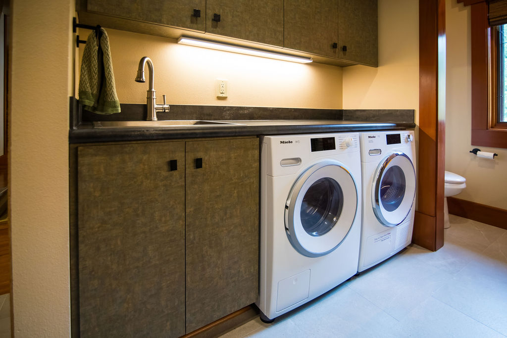 Small details mattered here too—matching laminate panels, careful stain work, and thoughtful placement transformed a purely functional area into a seamless extension of the home’s design.